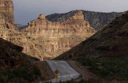 Giving some gravitas to the legend that the name Tavaputs means “sunrise” in the Ute language, the first rays of sunlight on the horizon paint the canyon in vivid colors. The distant glow of lights on the eastern horizon come from the community of Vernal, but they’re gradually taken over by the sun rising against a sky filled with brilliant orange, pink and violet tinged clouds.